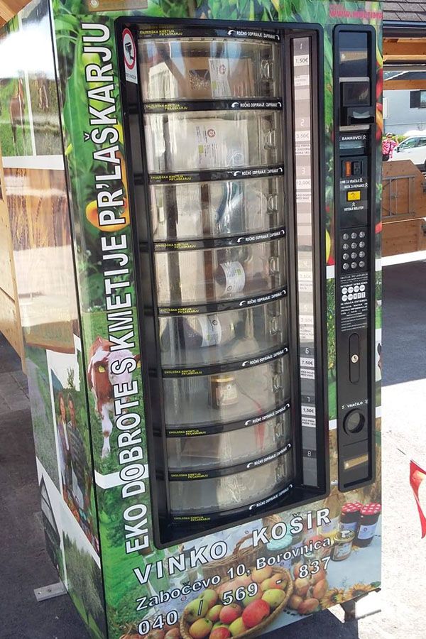 - del proizvodov (sokove, kis, jajca,..) v multimatu pred pošto v Borovnici, Molkov trg 12