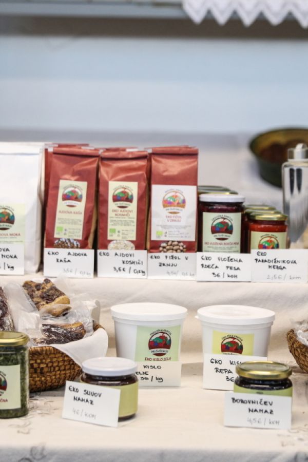 različne moke, zdrob, kosmiči, kaša, kruh, ocvirkovca, potratna potica, krompir, fižol, zelje, repa, čebula, por, koleraba, rdeča pesa, solata, namaz is sliv, zeliščne soli; govedina, svinjina, piščančje in kokošje meso, ekološka jajca, klobase, salame, panceta, slanina, krvavice, šunka,...