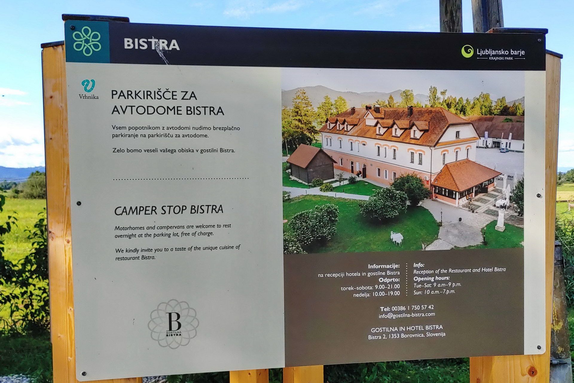 Parkirišče za avtodome Bistra je urejeno na parkirnem prostoru za gostilno in hotelom Bistra in samo 100m od tehničnega muzeja Bistra. Uporaba PZA Bistra je brezplačna, ni pa nobene dodatne oskrbe za avtodome (veseli vas bodo na zajtrku, kosilu ali večerji v Gostilni Bistra).
